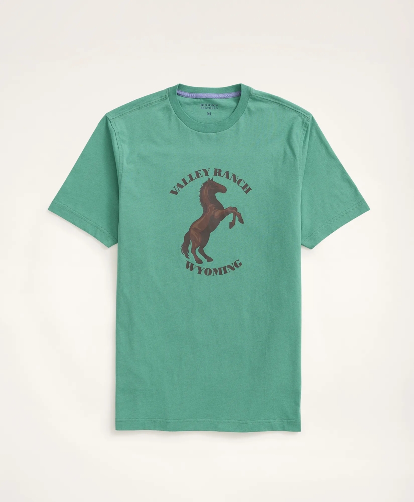 Signature fall style starts with our Valley Ranch tee in pure cotton jersey. This style is inspired by Valley Ranch, a Wyoming dude ranch owned by Winthrop Brooks, a great-grandson of our founder, Henry Sands Brooks, who opened the first Brooks Brothers store in 1818.