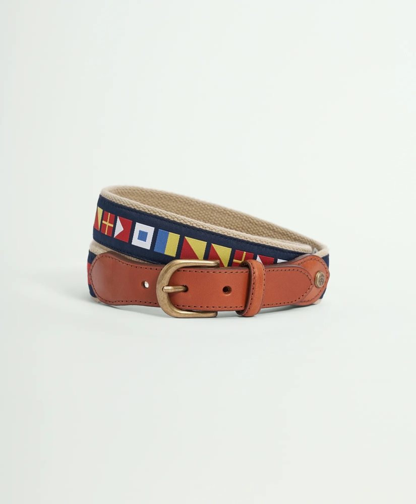 An ode to classic American style, our belt features a nautical flag motif that finishes your casual looks.