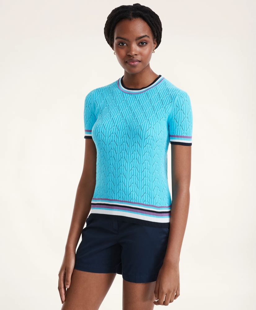 Delicate pointelle sweater is updated with bold tipping for a modern update to a classic style.