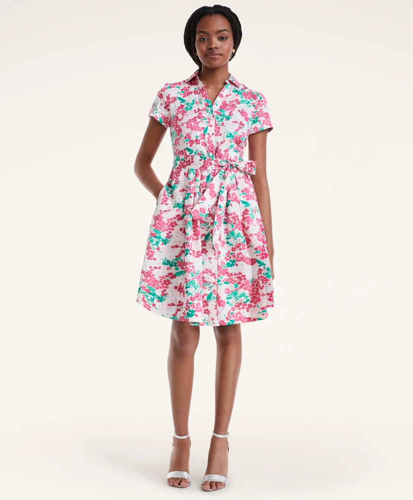 A stunning edition to spring/summer wardrobes, our classic shirt dress in pure cotton stretch features a self belt, short-sleeves and side seam pockets all in a beautiful floral motif for a touch of romance to elevated daywear.
