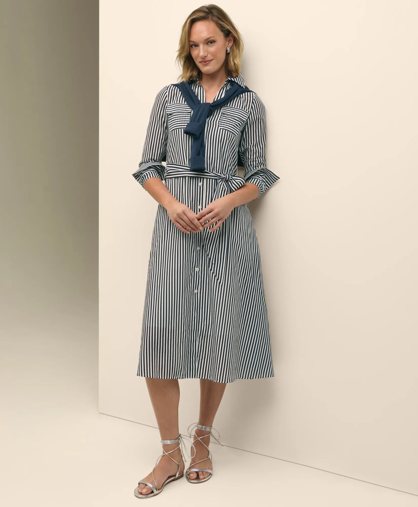 Classic utility style gets a luxurious upgrade with a fine silk blend and so-soft handfeel. We added vertical stripes, a belted waist and elegant full skirt that offers beautiful movement with signature pleating. Layer with jackets and sweaters now, wear on its own come spring.