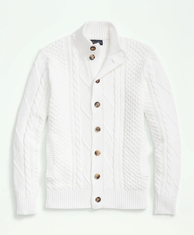 Crafted from breathable, light cotton, the classic Aran knit, aka fisherman pullover is reimagined as a substantial cardigan perfect for cozy nights spent by the fire. With its allover cable knit pattern, faux horn buttons, pockets and sophisticated stand collar, it's sure to become a personal classic.