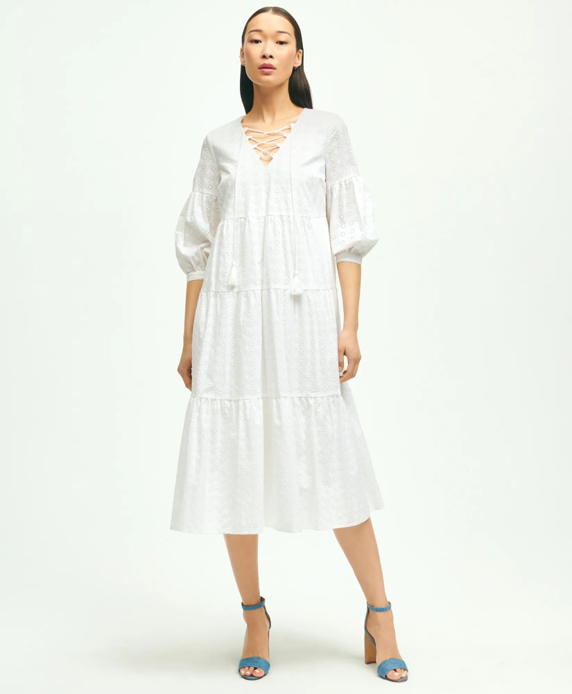 Cotton Tiered Eyelet Tie Neck Dress