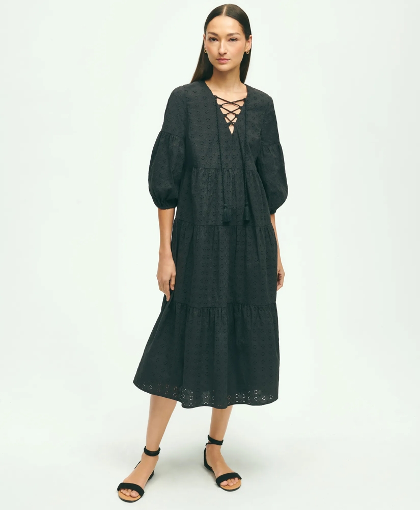 A top-tier style refresh, our dress features a flattering midi length, feminine eyelets and the kind of breezy silhouette that calls to mind romantic days spent on the coach.