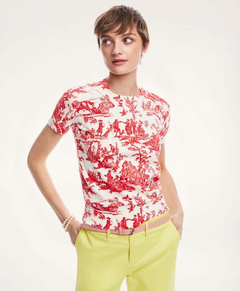 Toile fabrics have a storied heritage that mirrors our own, having originated from France in 1759. A fresh take on new-classic style, a toile pattern adorns a classic sweater shell.