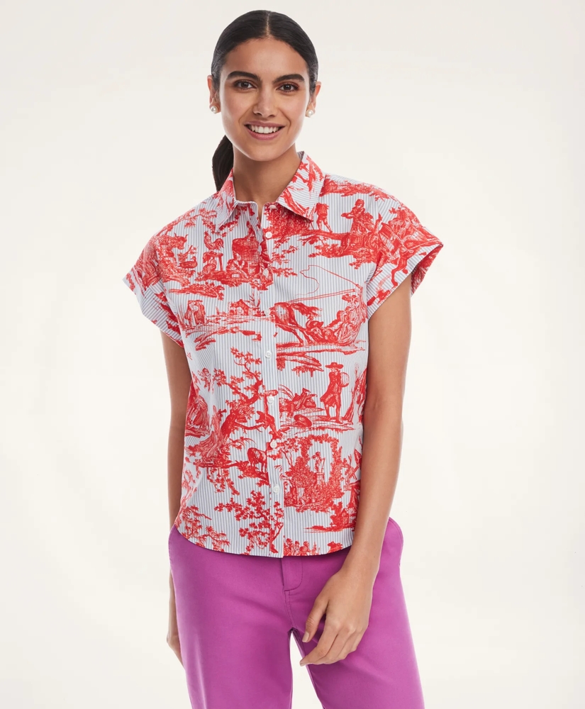 Toile fabrics have a storied heritage that mirrors our own, having originated from France in 1759. A relaxed fit and drop shoulder modernize the classic blouse in our striped version replete with lustrous faux-shell buttons.