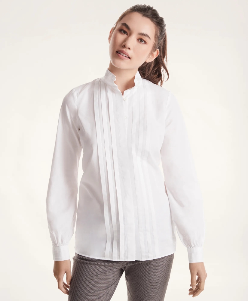 Mandarin collar; concealed button placket; pleated at front, cuffs and neck.