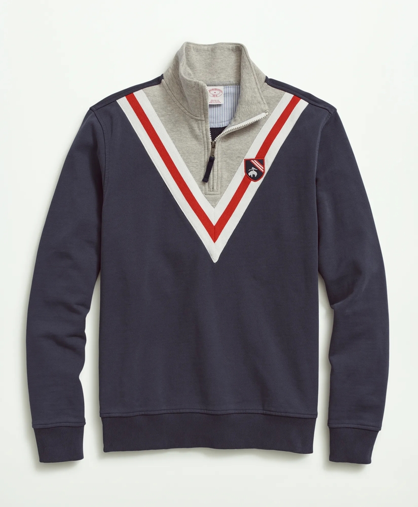 Inspired by vintage rowing uniforms and the enduring legacy of all things nautical, we crafted our colorblock half-zip from 100% cotton and added an archival Brooks Brothers embroidered crest.