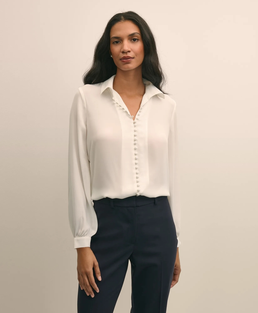 Delicate covered loop buttons and shirred sleeves lend an elegant air to our soft crepe blouse. We finished the look with a point collar for a timelessly chic statement piece.