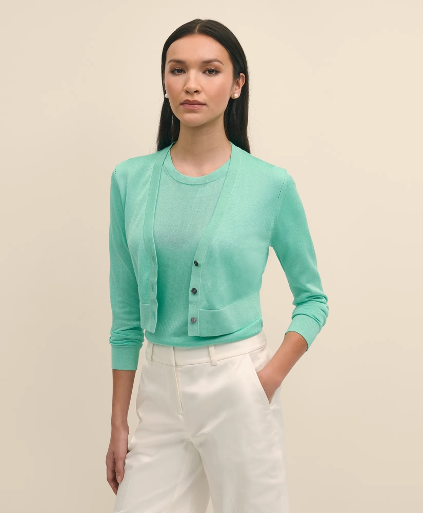 Just the layer you need to throw on over dresses, shells, tees and shirts. We crafted our cropped cardigan in a fine-gauge knit from beautifully smooth fibers that shimmer with a subtle metallic finish.