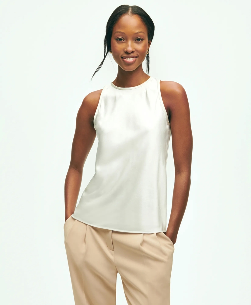 The perfect silk tank does exist. A luxe foundation with added stretch for all day comfort, and an added subtle cutaway shoulder with an ultra-flattering effect. Wear it under a jacket at work and show it off on its own for nights out.