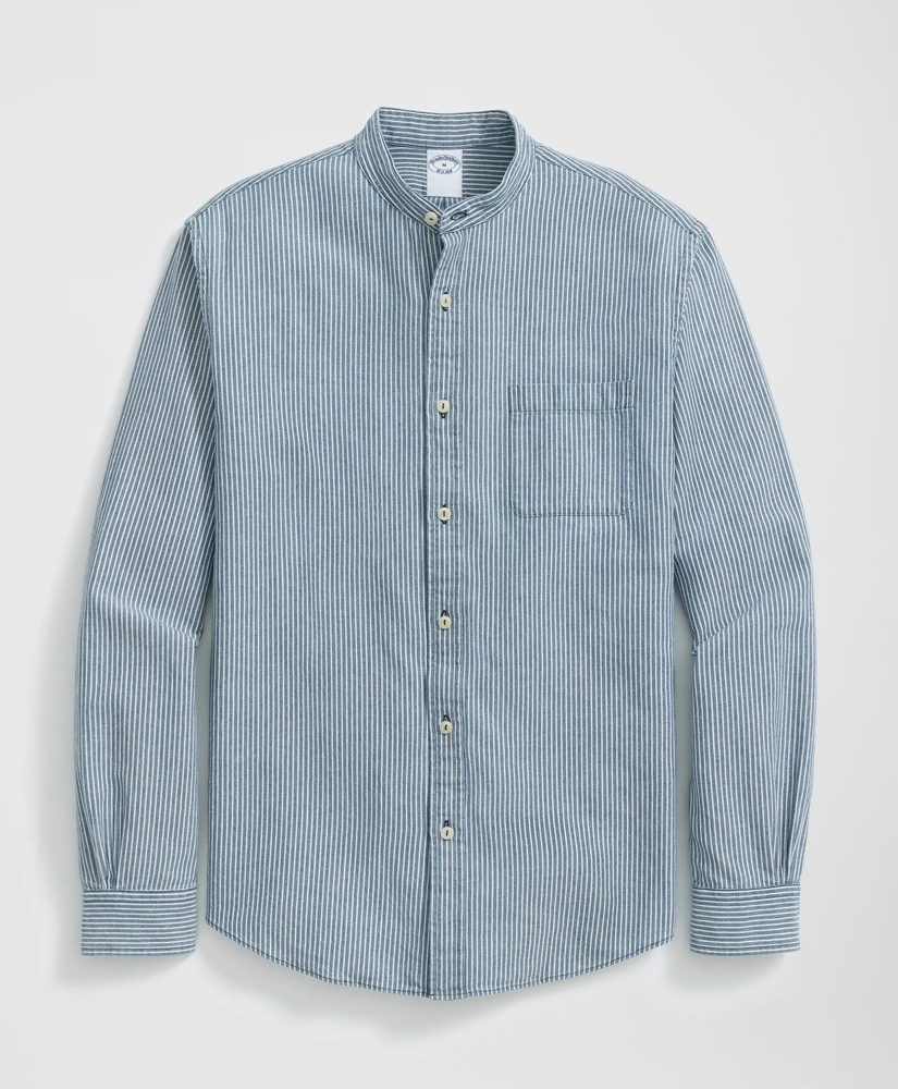A classic with a style-forward twist, our denim shirt features a handsome band collar and indigo-stripe in a pure cotton fabrication. Finished with an ideal garment wash for soft comfort that feels like you've been wearing, and loving, it for years.