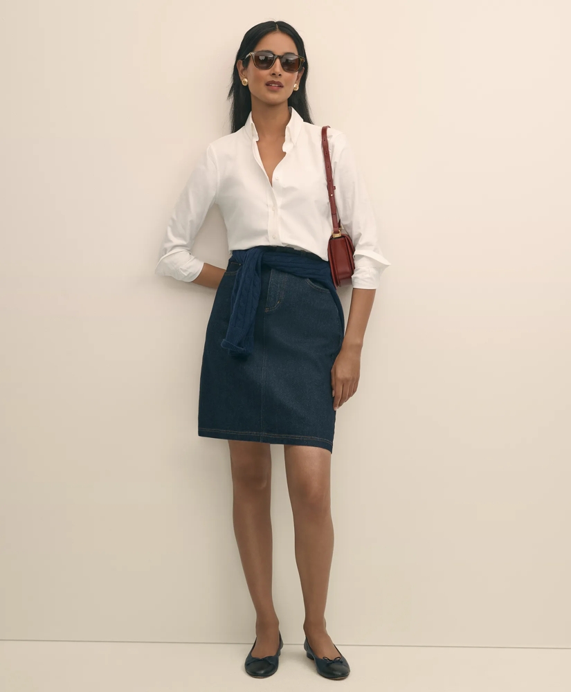 A denim straight skirt is core to a classic fall wardrobe. Ours is an absolute win with a dark, but not too dark, wash, a touch of stretch and the perfect length for boots, flats and sneakers. We love it with our modal-cashmere turtleneck and silk-charmeuse tops.