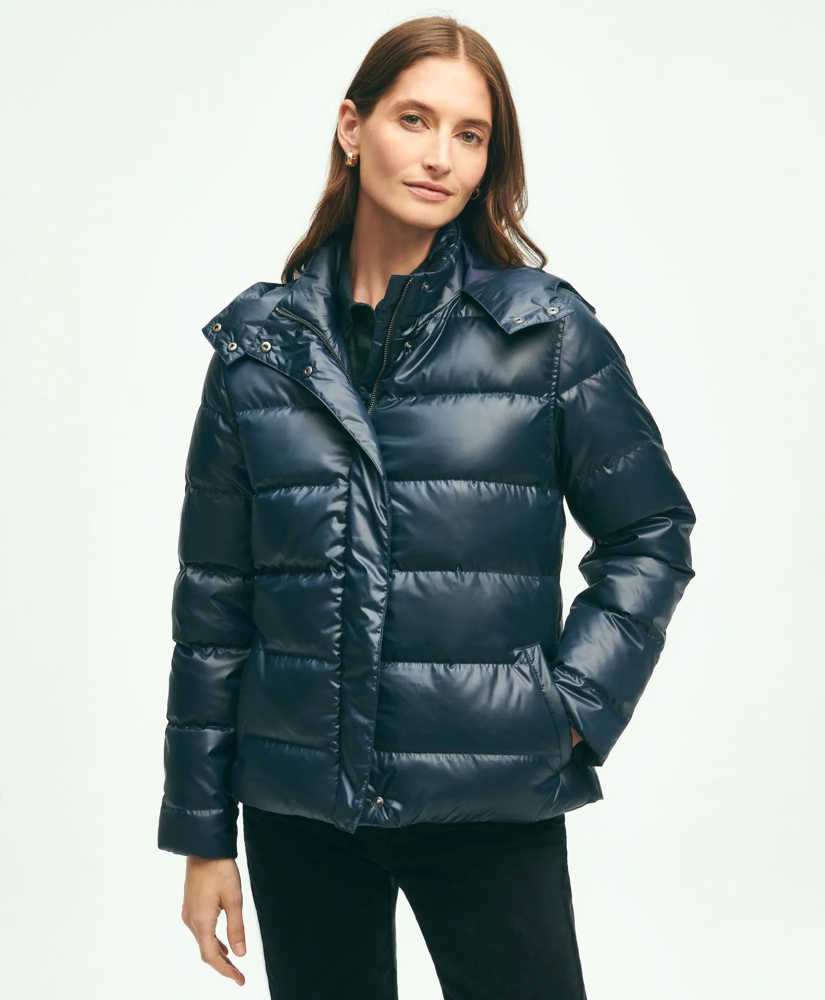 This channel quilted puffer gets the Brooks Brothers treatment with genuine down fill. Additional features include a front zip with a hidden snap closure, fleece lined pockets and a hood.