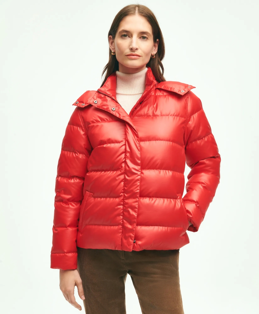 This channel quilted puffer gets the Brooks Brothers treatment with genuine down fill. Additional features include a front zip with a hidden snap closure, fleece lined pockets and a hood.
