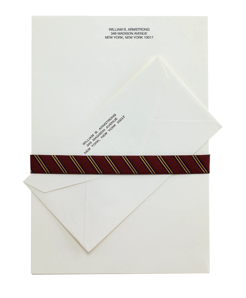 Elegant 100% cotton ivory stationery with the Brooks Brothers watermark. Genuine letterpress printing of your three-line name and address on the letter sheet and envelope. Executive sheets. 7 ¼" x 10½". Made in the USA. Please allow 2-3 weeks for delivery. Personalization is done in charcoal grey ink for a vintage look.