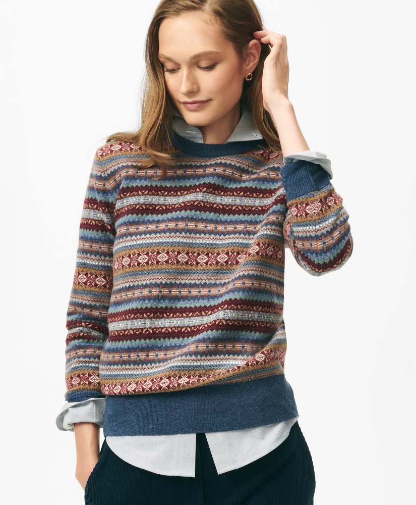 Classic Fair Isle gets an update in our seasonal palette with beautiful shades of merlot, deep lavender and hints of cream. We're pairing it with our go-to jeans, cords and skirts, for an elevated take on casual polish.