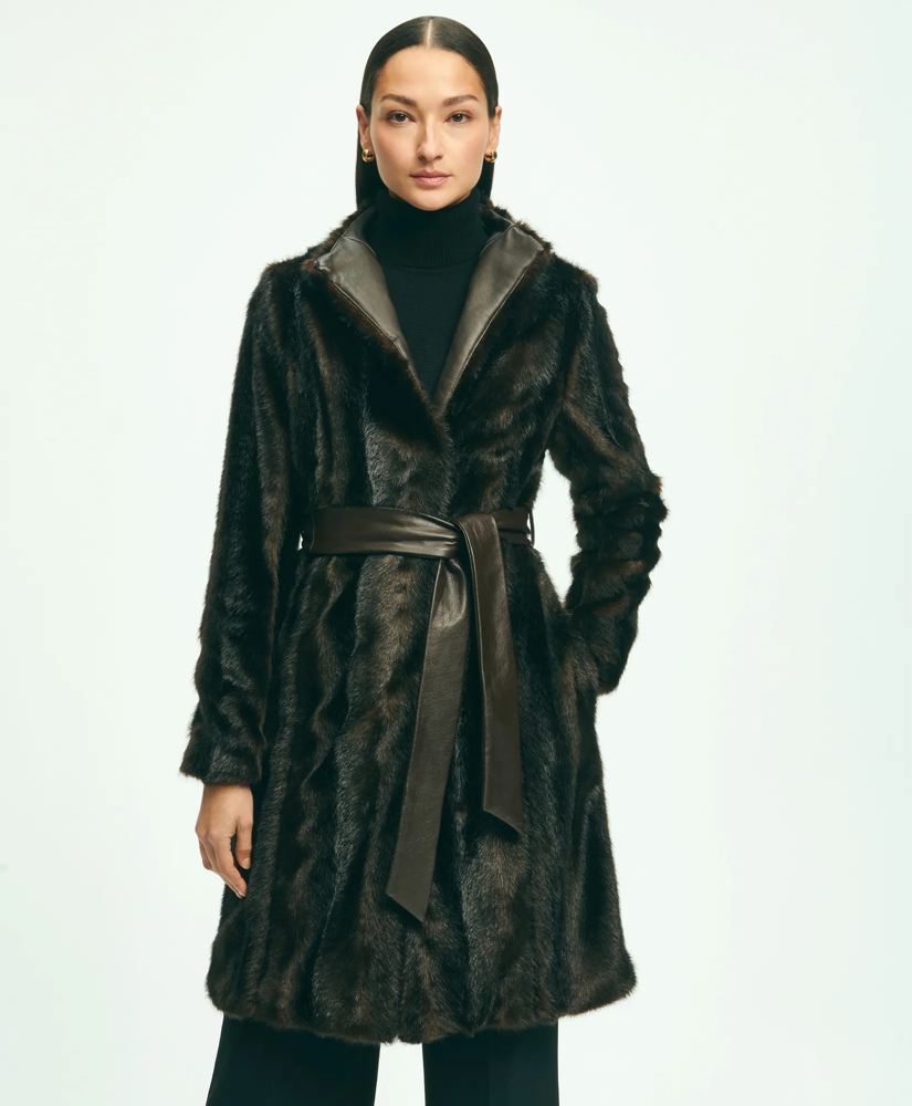 Rich chocolate-brown shades in superlative faux fur mark a statement piece that will be the envy of your outerwear wardrobe this season and beyond. A removable leather belt and side-seam pockets finish one of our favorite coats to perfection.