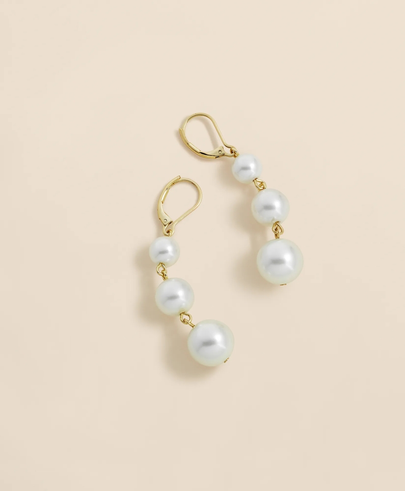 Understated and elegant, these drop earrings feature gleaming white glass faux pearls suspended from lever-back hooks. A polished accent for any outfit.