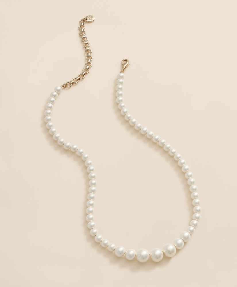 Add a classic touch to your wardrobe with our pretty faux-pearl necklace. We finished the piece with gold plating and e-coating, a treatment that prevents tarnishing and corrosion for long-lasting style.