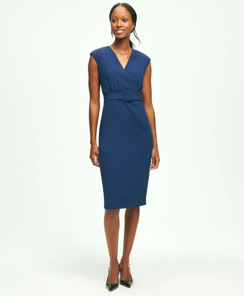 This is your power dress. We crafted beautifully creped fabric into a perfect sheath silhouette. Then we added shape-defining details that compliment every figure: A wrap V-neck, subtle shoulder pads for structure and a belted, shirred waist.