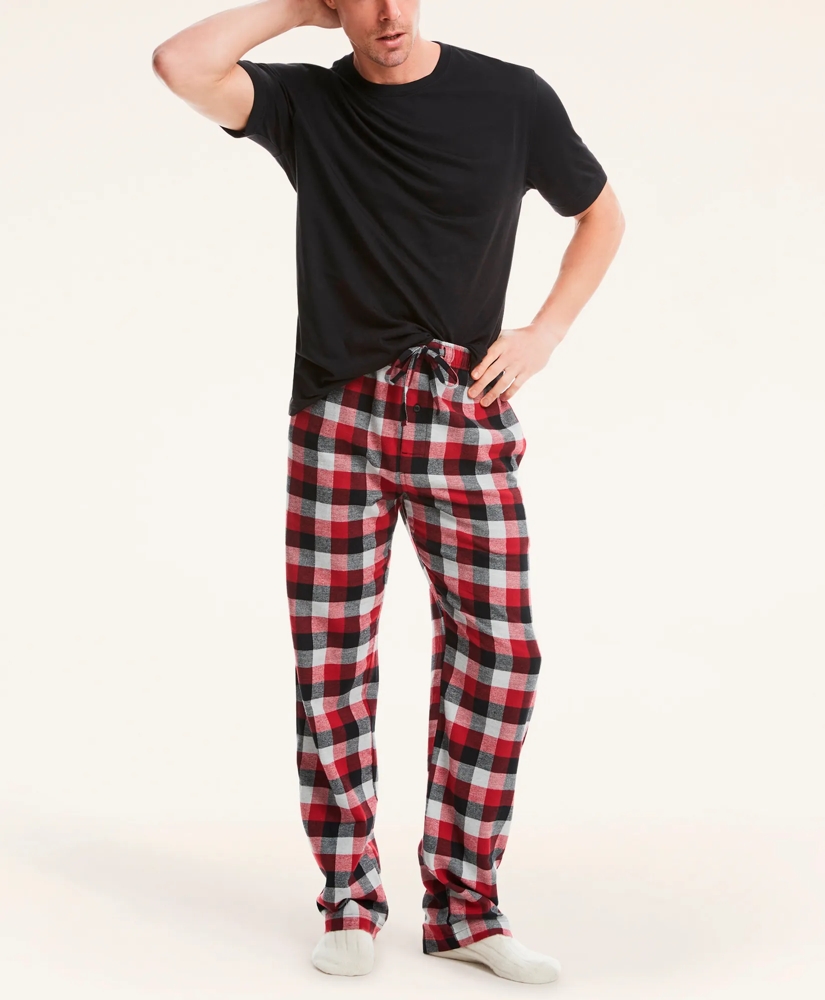 Cozy comfort in a paired lounge set. Short-sleeve crewneck t-shirt in knit jersey paired with flannel lounge pants crafted with an elastic waistband, drawcord and side entry pockets.