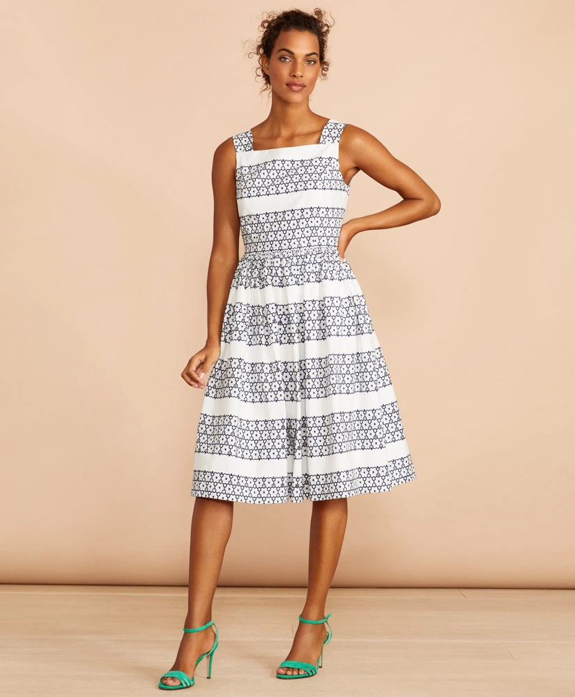 Pure feminine perfection: Beautiful floral embroidery makes this breezy cotton eyelet sundress a surefire summer favorite. This sweet frock features a square neckline, wide straps, a full skirt with a gathered waist, and a concealed back zip closure. Fully lined in cotton.