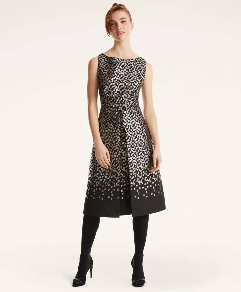 Stunning floral jacquard with a hint of metallic finish offers the perfect party dress for cocktails and holiday fetes alike.