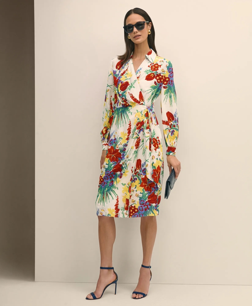 Go bold with our pretty bright floral print in this wrap dress crafted to get compliments. Blouson sleeves and a tie waist offer a lovely shape while delicately textured crepe finishes with a feminine touch.