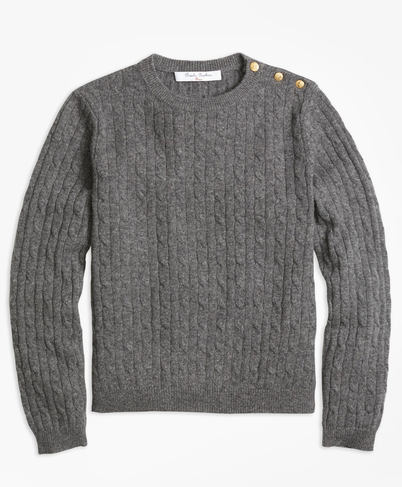 Crafted in soft cashmere, this cable crewneck sweater is the perfect fall top. Gold buttons at shoulder placket. Rib trim at neckline, bottom hem and sleeve cuffs. Dry clean. Imported.