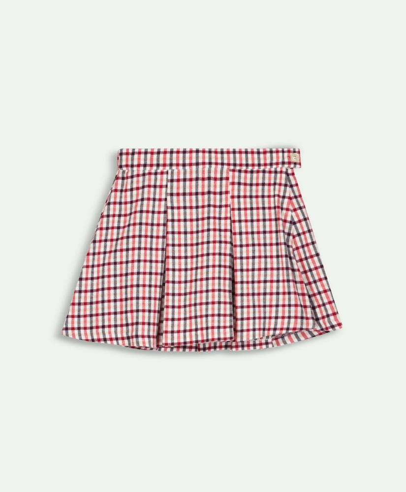 Pleated skirt is crafted in soft flannel. The gingham pattern adds polish to school pictures and holiday gatherings. Side zipper with button closure. Built in knit shorts add additional comfort and modesty.
