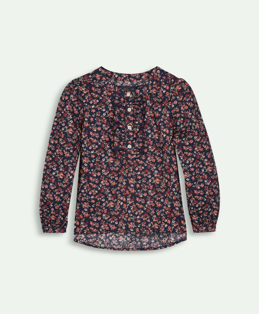 Peasant style blouse features a ruffle trim at the half placket, shirring at shoulder and sleeve cuff and slight high-low hem.