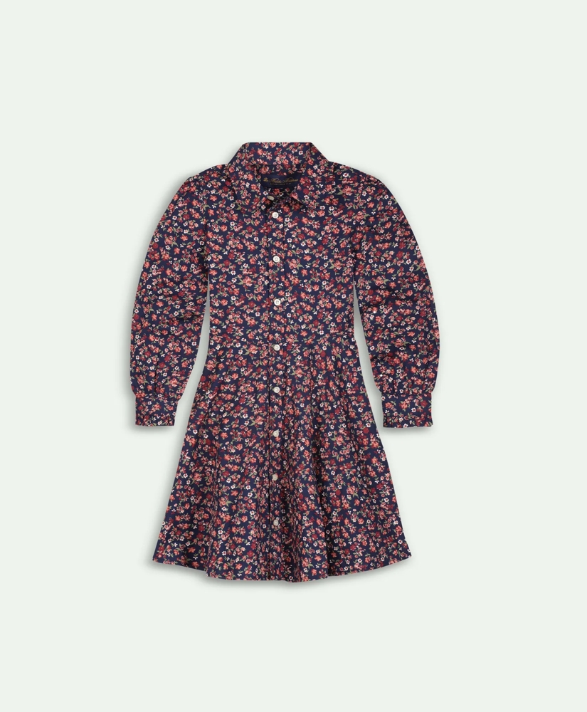 Classic shirt dress in a feminine floral print. Front button closure, slight shirring at the shoulders and ruffle at cuff add a famine touch.