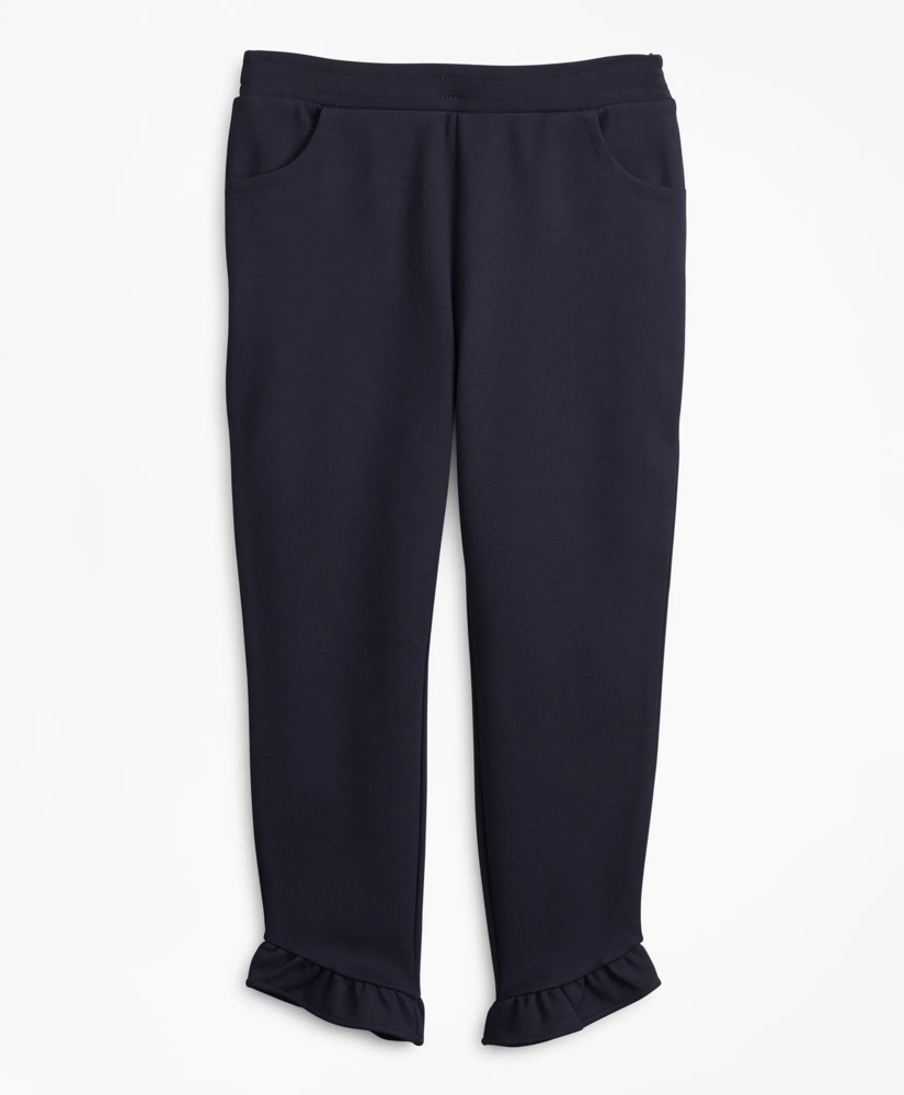 Our knit ponte pants get a subtle upgrade with ruffles at the cuffs and a side zip closure. Hidden adjustable waistband on sizes 4-16 fine-tunes for the perfect fit. Machine wash. Imported.