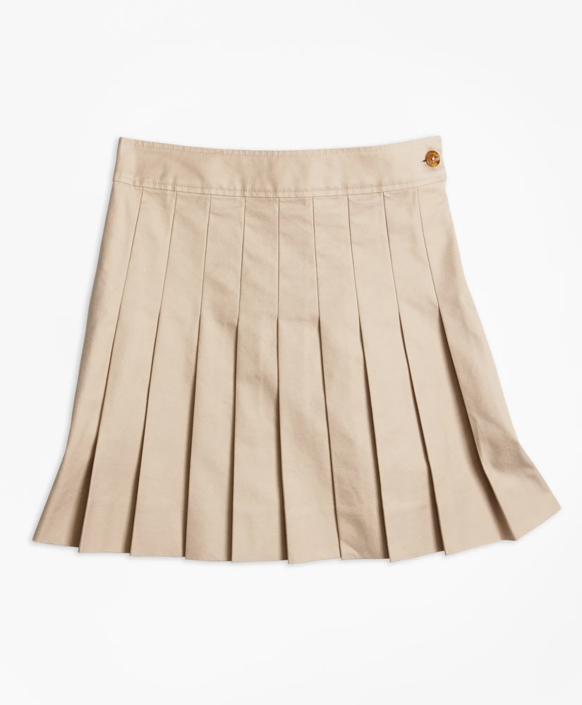 Pleated Chino Skirt crafted in pure cotton. Side button and zip closure. Hidden adjustable waistband on sizes 4-16 fine tunes for the perfect fit. Falls at a school appropriate length. Machine wash. Imported.