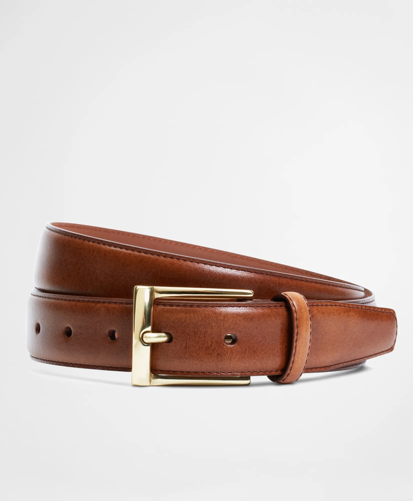 Belt with gold plated buckle. Stitched edges. Leather backing. Calfskin leather. Leather lined. 1¼" wide. Made in Italy.