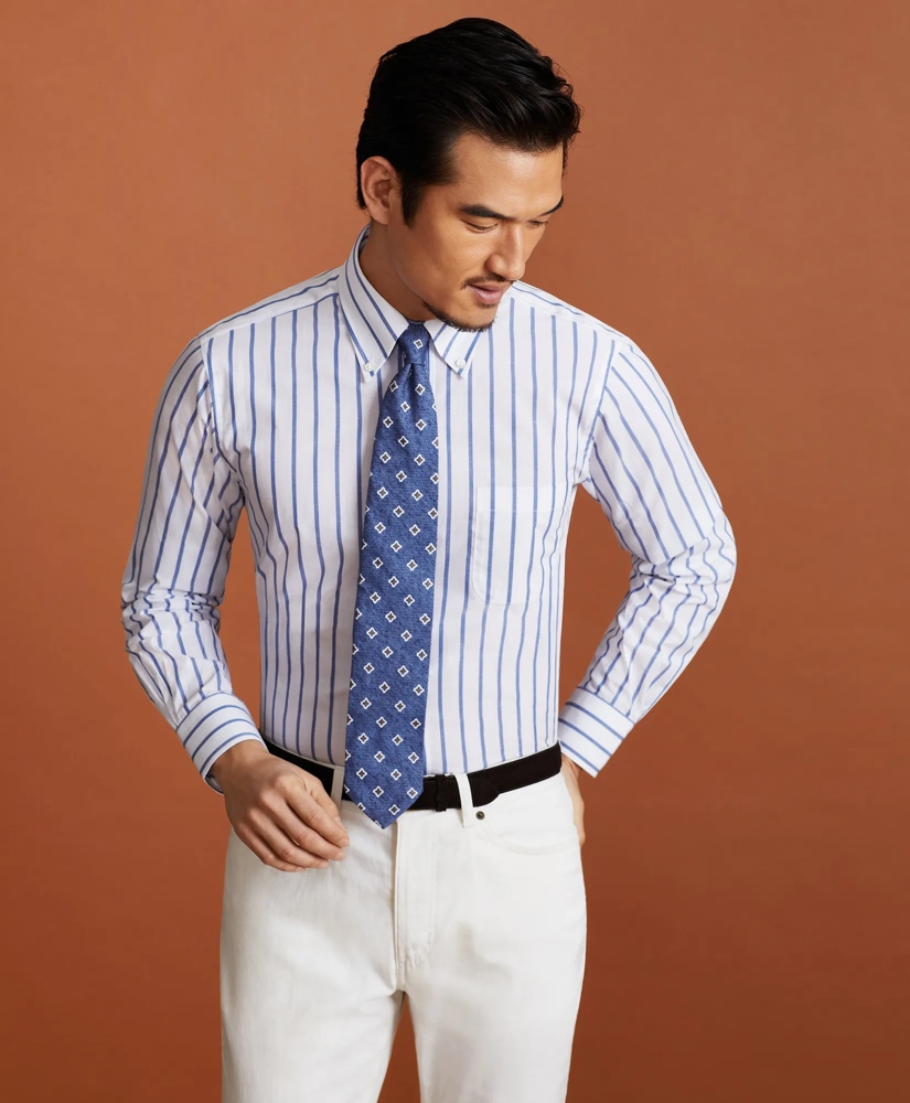 Made from pure cotton woven in Italy by the renowned Thomas Mason® mill, this lightweight and breathable striped fitted dress shirt features our classic button-down collar, a clean front and a chevron split-back yoke at the shoulders. You'll find our signature 6-Pleat Shirring® just above the double-button barrel cuffs, an unmistakable sign that this is a Brooks Brothers shirt. 100% cotton. Machine wash or dry-clean. Made in the USA from imported materials.