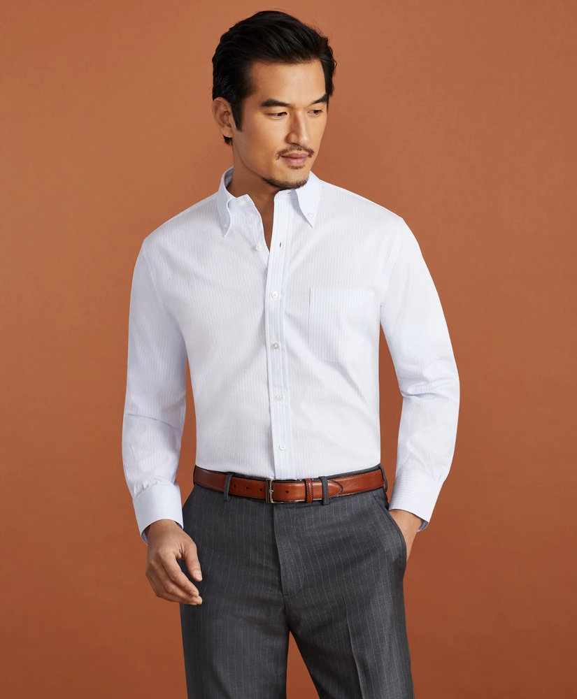 Made from pure cotton woven in Italy by the renowned Thomas Mason® mill, this lightweight and breathable striped fitted dress shirt features our classic button-down collar, a pocket at the chest and a chevron split-back yoke at the shoulders. You'll find our signature 6-Pleat Shirring® just above the double-button barrel cuffs, an unmistakable sign that this is a Brooks Brothers shirt. 100% cotton. Machine wash or dry-clean. Made in the USA from imported materials.