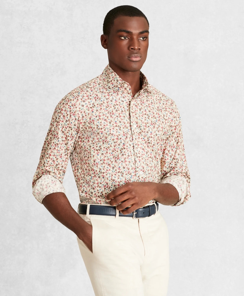 This stylish sport shirt has a bold floral pattern and a shorter length, allowing it to be easily worn either tucked or untucked. Crafted from 100% soft cotton woven by Thomas Mason® mills, this comfortable shirt offers a sense of fun and refinement you'll appreciate on weekdays and weekends. Spread collar. Meticulously crafted in the United States at our manufacturing facility in Garland, North Carolina. Machine wash. Made in the USA from imported materials.