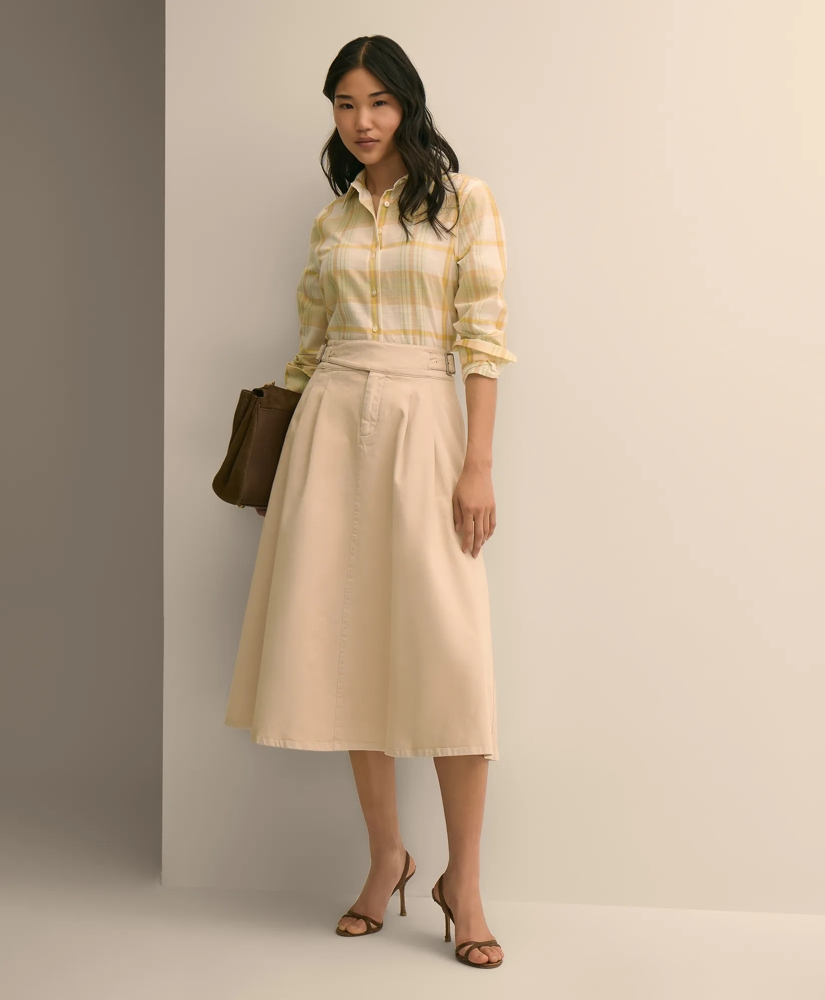 Utility meets femininity in our full skirt with a military-inspired Gurkha waistband. Done in a cotton blend, we added pleats for movement and just-right stretch for all-day comfort. And of course, it has pockets!