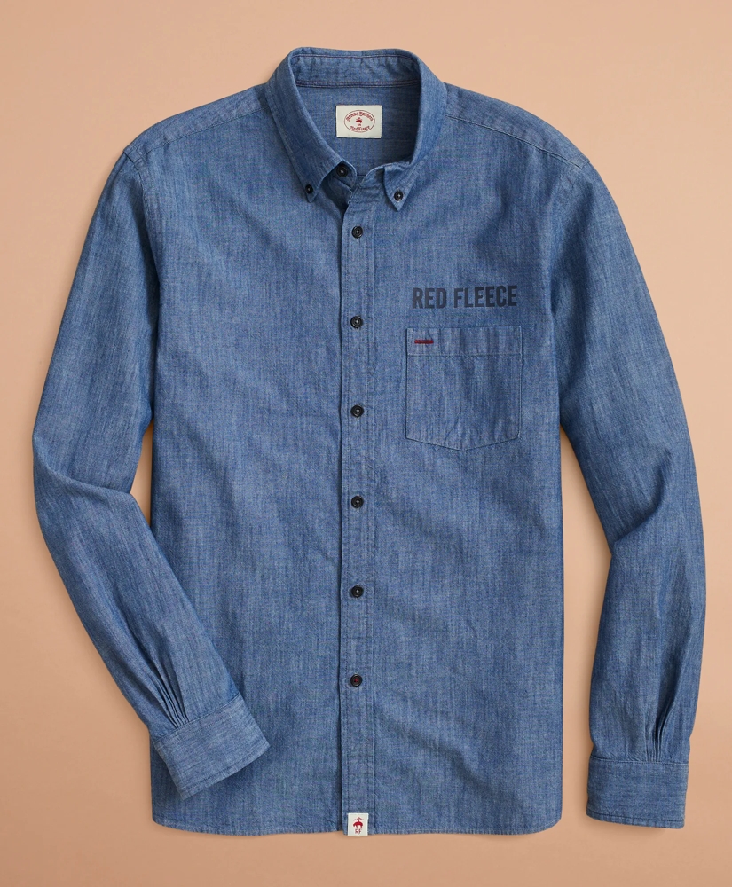 This chambray shirt gets its rich blue hues from real indigo dye, which means it will softly acquire a singular, broken-in look that only improves with age. Features include a button-down collar, our name printed above the chest pocket and our Red Fleece NYC logo on the back, our signature 6-Pleat Shirring® at the barrel cuffs and a box pleat at the back yoke. Logo tab at the lower hem.