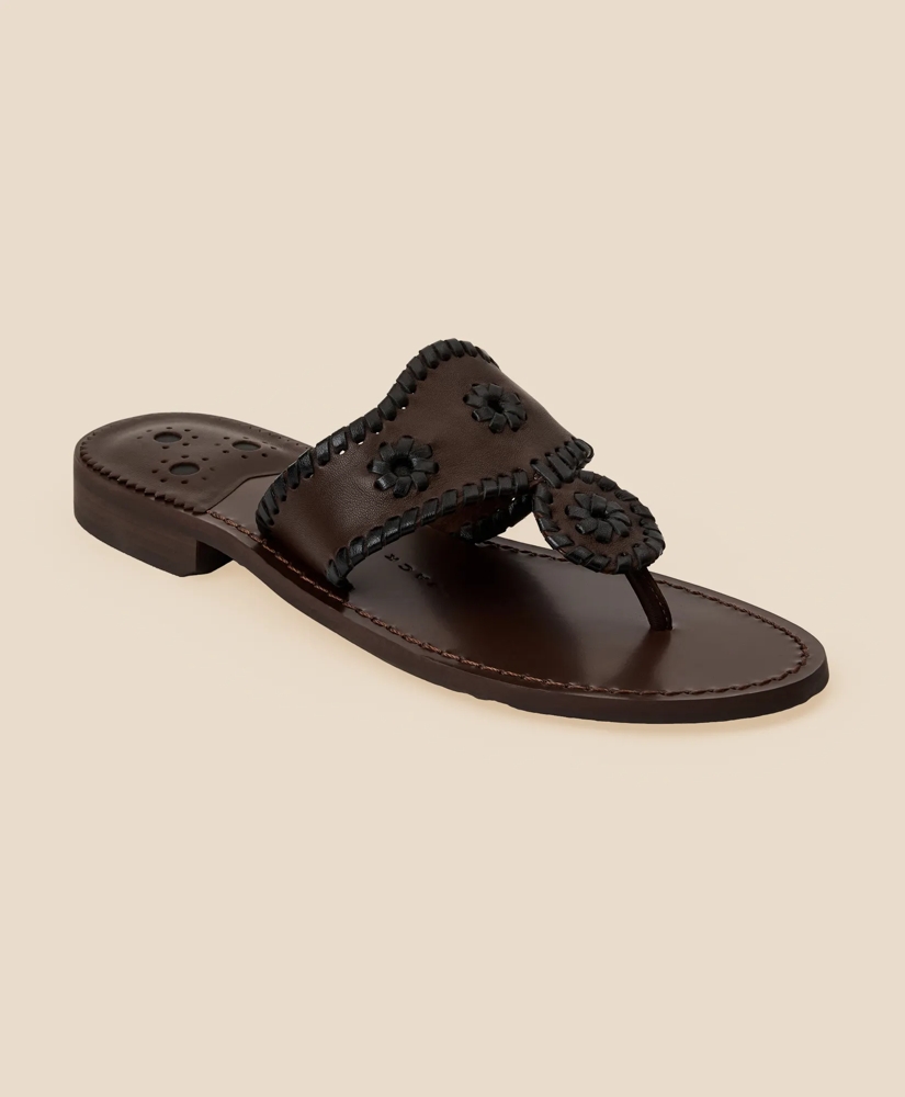 Beloved for over 60 years, the Jacks Flat Sandal is a minimalist style with timeless appeal, and new to Brooks Brothers' Women's Collection. Crafted with premium leather, these signature summer sandals feature a rondelle-accented upper with iconic whip stitch details and a matching heel pad. Inspired by effortless elegance, this design has become a symbol of chic, sophisticated travel style. The slim sole and flat block heel make them the perfect travel sandals for weekend trips and far-off destinations.