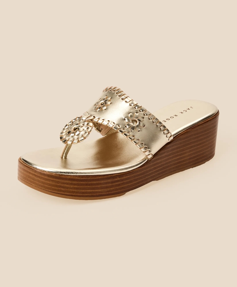 Make a statement with the Jack Rogers Platinum Wedge sandals. Crafted with metallic leather, this spring wedge combines comfort with classic style to create a new wardrobe staple. A 2" wedge heel wrapped in leather delivers elevated ease for all-day wear.