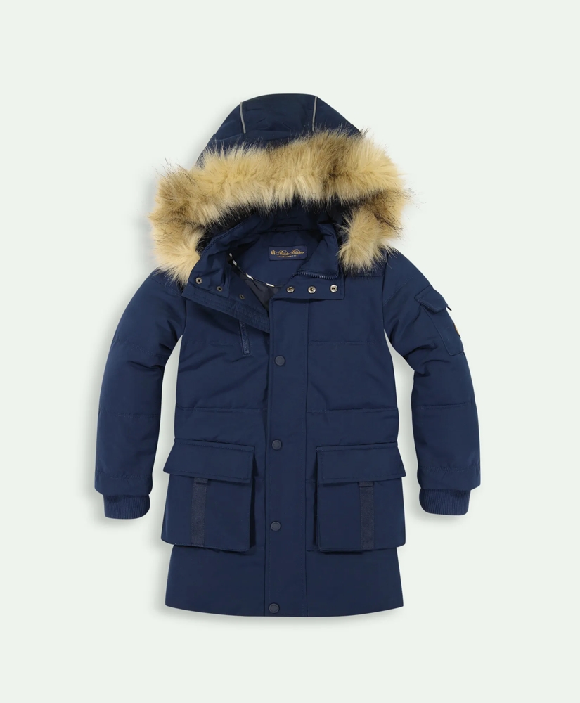 Elevate their cold-weather wardrobes with our new children's outerwear, blending classic design with contemporary flair. The ultimate cold-weather coat, features a hidden zip closure with logo snap placket. Removeable hood, storm cuffs, with faux fur trim and reflective taping at hood for extra safety.