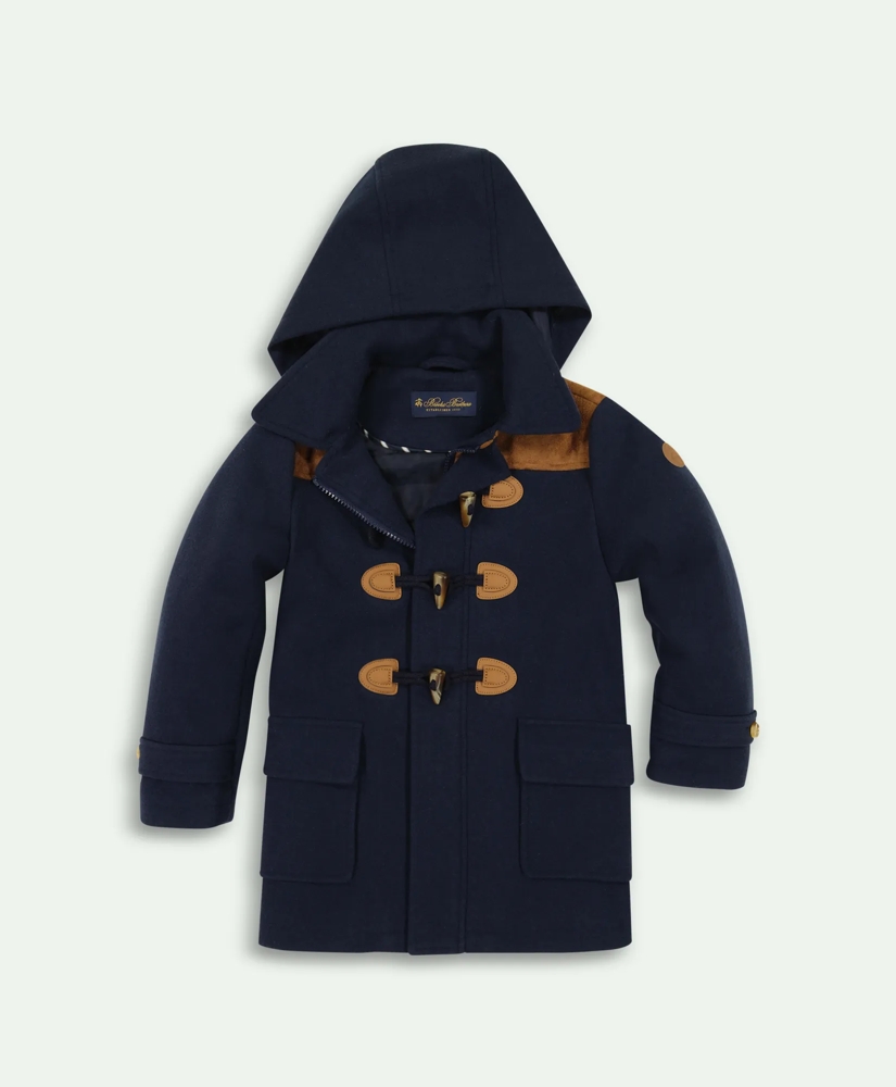 Elevate their cold-weather wardrobes with our new children's outerwear, blending classic design with contemporary flair. Our classic duffle coat features a removeable hood, hidden front zipper with faux horn toggle closures. Faux suede trim and an embossed faux leather logo patch at the shoulder.