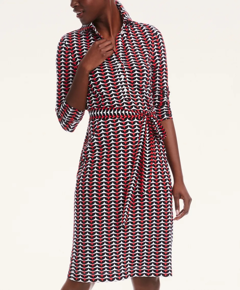 Smooth, soft jersey is constructed into the perfectly flattering fit of a half placket shirt dress with a removable belt and features one of our new seasonal prints inspired by our archives.