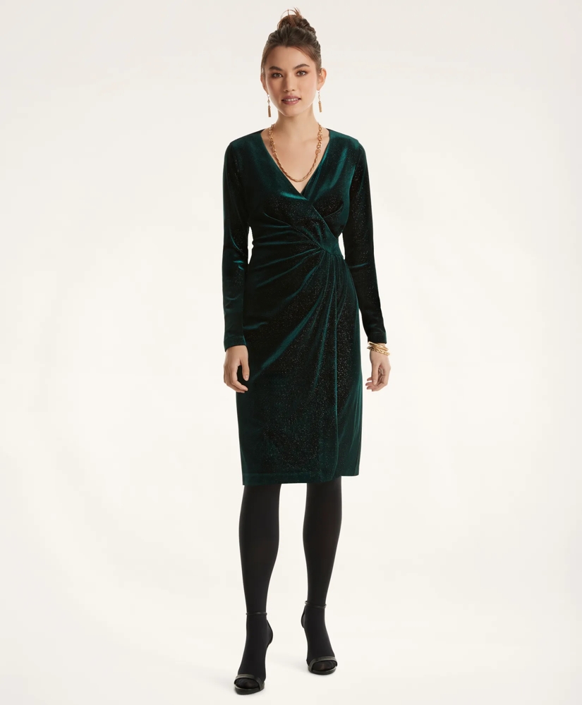 Stunning knit liquid velvet catches the light while side ruching offers a flattering shape, and an innovative stretch lining provides added comfort.