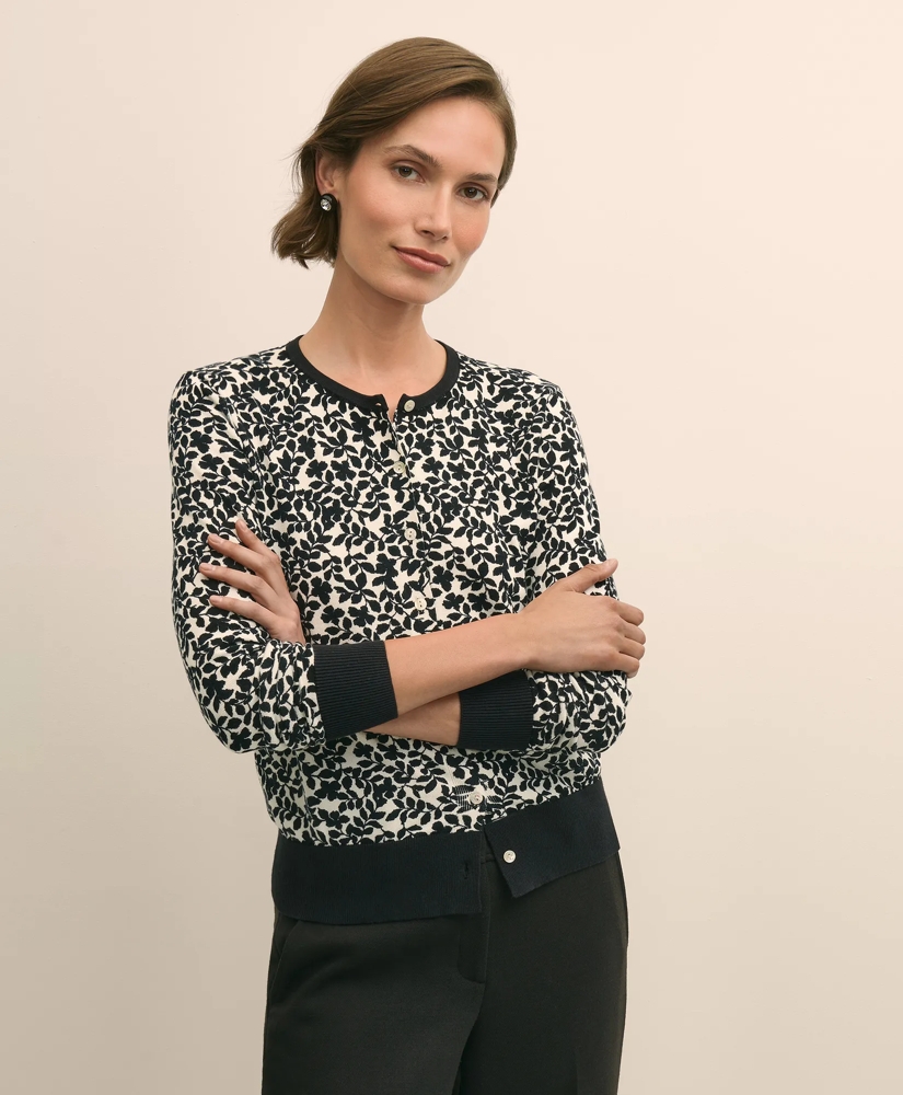 A timeless cardigan, updated with the signature leaf print of the season. Knit from pure cotton in a fine 14-gauge jersey stitch, this piece offers lightweight warmth and classic style. Genuine shell buttons provide a natural, polished finishing touch. Pair with our matching shell for coordinated style.
