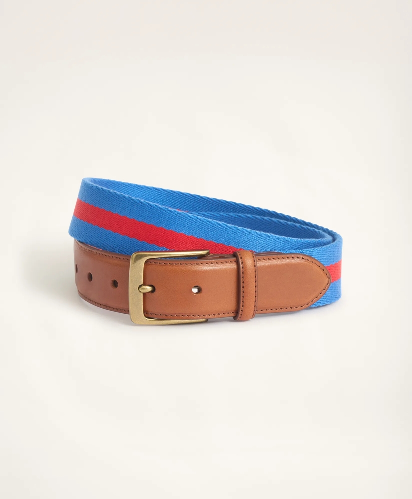 Classic stripe webbing features genuine leather tabs in our single-prong belt.