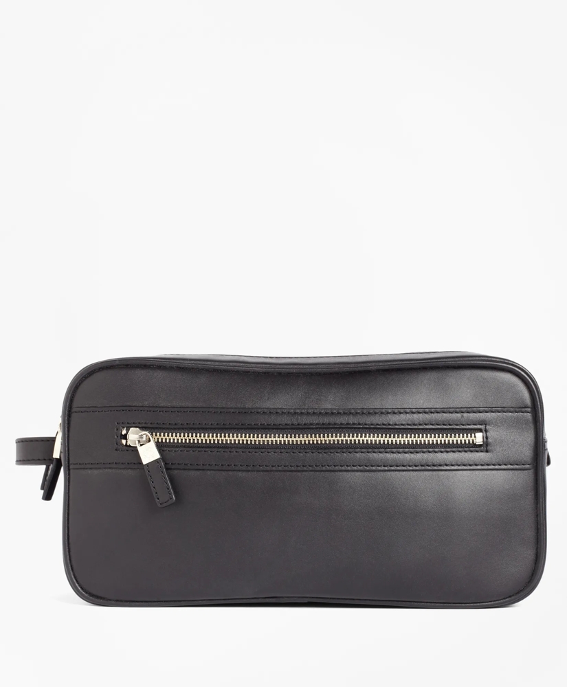 Genuine leather with double zip. Two separate interior compartments with a zipper pocket. Polyester navy diagonal lining. Outside zipper pocket. 11½" x 5" x 4". Imported.